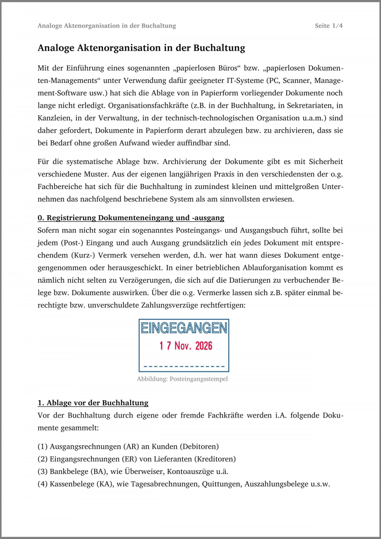 Für die systematische Ablage bzw. Archivierung der Dokumente gibt es mit Sicherheit verschiedene Muster. Aus der eigenen langjährigen Praxis in den verschiedensten der o.g. Fachbereiche hat sich für die Buchhaltung in zumindest kleinen und mittelgroßen Unternehmen das nachfolgend beschriebene System als am sinnvollsten erwiesen – mehr dazu im Folgenden (zum Volltext Bild anklicken):