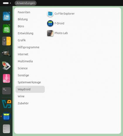 WAYDROID selbst kann dann wie ein normales LINUX-Programm über die Dash gesucht und aufgerufen werden, findet sich aber auch unter Anwendungen als Anwendungsgruppe (bzw. Container) wieder, in der die nachträglich installierten App’s aufgeführt sind (im obigen Beispiel also F-DROID, Cx Datei-Explorer und Foto Lab):