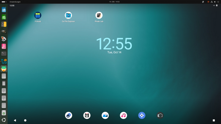 WAYDROID kann mit der freien ANDROID-Basisversion VANILLA oder der proprietären ANDROID-Version von GOOGLE initialisiert werden. Bei der Initialisierung wird die gewünschte Version für die Einrichtung des WAYDROID-Containers abgefragt, wobei die später gestartete ANDROID-Oberfläche dann auch entsprechend aussieht. Das folgende Bild zeigt einen WAYDROID-Container nach einer VANILLA-Initialisierung mit den einschlägig vorinstallierten VANILLA-App’s (untere Leiste) und den weiterhin installierten App’s F-DROID, Cx Datei-Explorer und Foto Lab (DMCC):
