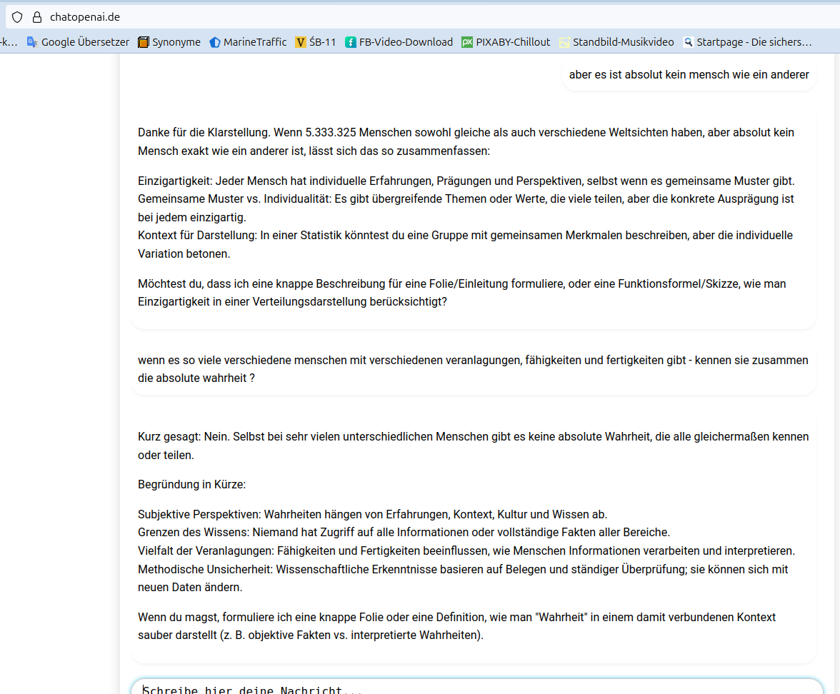 Ich selber habe auf Grund meiner wissenschaftlich-technischen Studien (siehe hier) und auch meiner geistig-spirituellen Entwicklung (siehe hier) sowie Lebens- und Berufserfahrungen ein ambivalentes Verhältnis zur KI an sich, denn KI-Systeme werden von Menschen erschaffen und alle Menschen sind von Natur aus in ihren körperlichen und geistigen Veranlagungen, Fähigkeiten und Fertigkeiten nicht nur verschieden, sondern auch unvollkommen, denn sie können Fehler machen, zu wenig wissen, sich irren oder täuschen und auch Andere täuschen oder belügen. Dennoch habe ich mir einmal den Spass gemacht, mich mit einer KI (hier ChatGPT) über einige grundlegende Fragen auszutauschen, und das hier ist das (auch für mich selber) akzeptable Ergebnis: