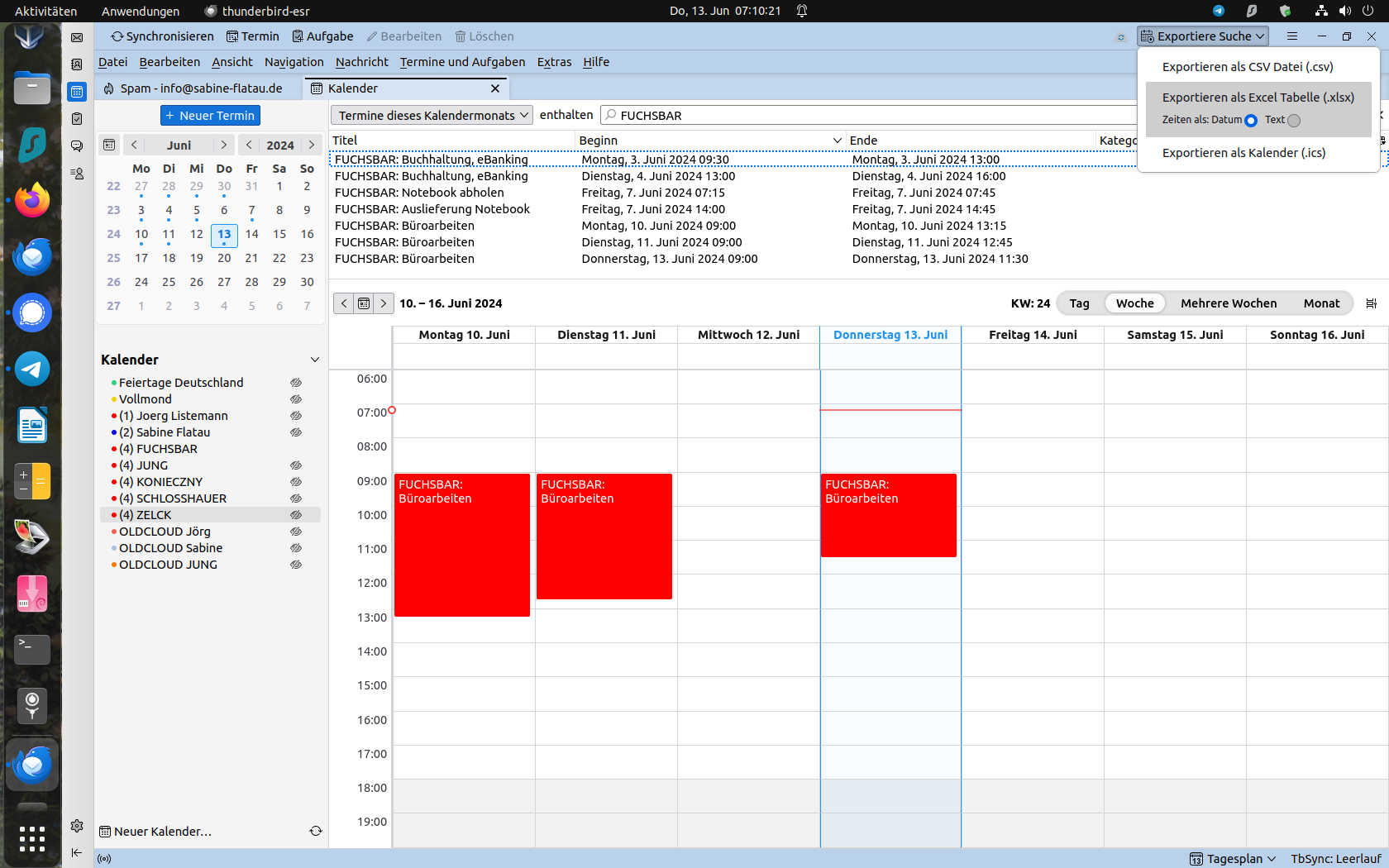 In THUNDERBIRD kann man mehrere und zugleich voneinander unabhängige Kalender anlegen. Ob diese Kalender innerhalb von THUNDERBIRD oder extern über ein Netzwerk, Clouds und Dergleichen geführt werden, ist erst einmal belanglos, und derartige Einrichtungen sind auch nicht Gegenstand dieses Beitrages. Legt man nun verschiedene personen- und/oder sachbezogene Kalender an, so erhalten sie in der Regel auch entsprechende Bezeichnungen und zur besseren Unterscheidung verschiedene farbliche Markierungen. Und nun geht es darum, einen ganz speziellen dieser Kalender für sich oder eine Gruppe von Kalendern gemeinsam auszuwerten, d.h. weitestgehend automatisiert zu ermitteln, wie viel Zeit personen- oder sach- bzw. projektbezogen innerhalb eines ausgewählten Zeitraumes beansprucht wurde …