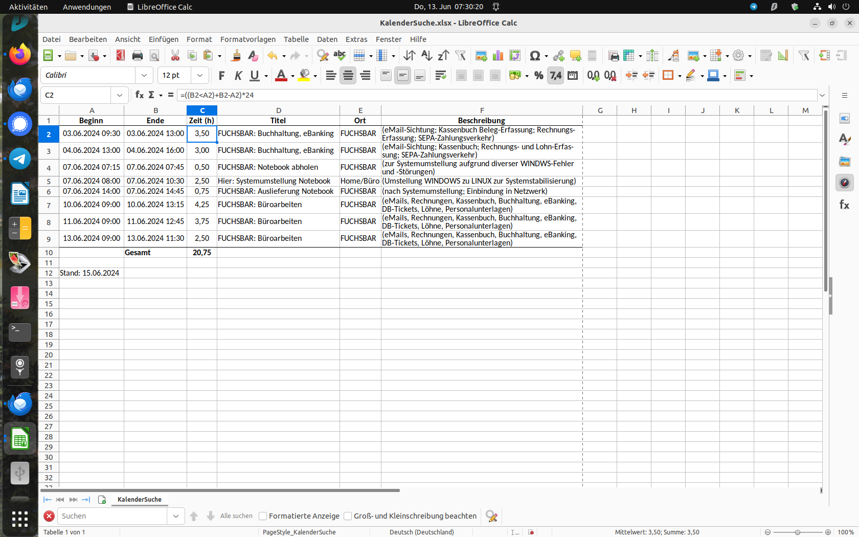 Die Auswertung und Nachbearbeitung der Kalenderdaten (Zeiten) in LibreCalc wurde manuell vorgenommen und ist an sich einfach: Zunächst müssen die Zellen in den ersten beiden Spalten mit den Beginn- und Ende-Zeiten dem Datums-Format (vorzugsweise TT.MM.JJJJ HH:MM) entsprechen. Wie dann aus Bild 7. (Berechnung der Zeitfifferenzen) ersichtlich, werden in der dritten Spalte zeilenweise die Zeitdifferenzen zwischen dem Beginn und dem Ende einer Arbeit bzw. eines Termines über die Formel =((B2<A2)+B2-A2)*24 errechnet – die hier für die 2. Zeile geltende Formel ist in die Folgezeilen zu kopieren und passt sich dabei automatisch an. Aus Bild 8. (Berechnung der Gesamtzeit) ist ersichtlich, wie diese Zeitdifferenzen in der entsprechenden Spalte über die Formel =SUMME(C2:C9) aufsummiert werden – die im Beispiel für 8 Zeilen geltende Formel ist bei anderer Zeilenanzahl selbstverständlich anzupassen.