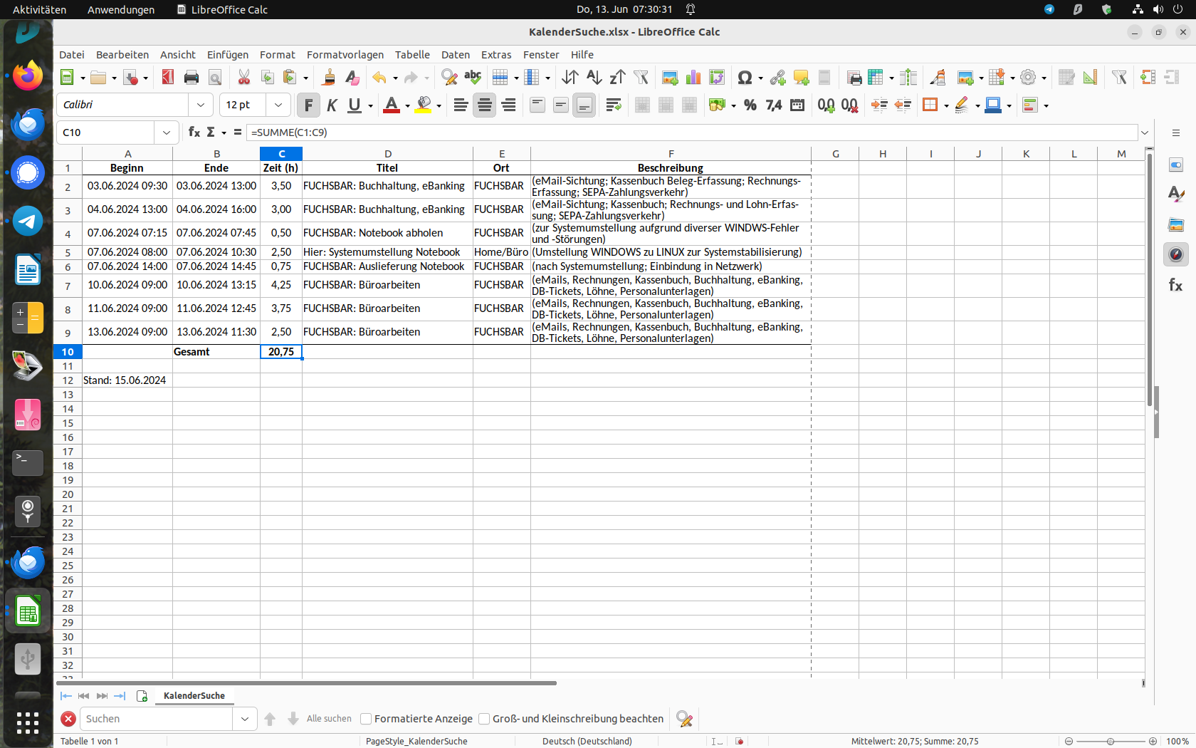 Die Auswertung und Nachbearbeitung der Kalenderdaten (Zeiten) in LibreCalc wurde manuell vorgenommen und ist an sich einfach: Zunächst müssen die Zellen in den ersten beiden Spalten mit den Beginn- und Ende-Zeiten dem Datums-Format (vorzugsweise TT.MM.JJJJ HH:MM) entsprechen. Wie dann aus Bild 7. (Berechnung der Zeitfifferenzen) ersichtlich, werden in der dritten Spalte zeilenweise die Zeitdifferenzen zwischen dem Beginn und dem Ende einer Arbeit bzw. eines Termines über die Formel =((B2<A2)+B2-A2)*24 errechnet – die hier für die 2. Zeile geltende Formel ist in die Folgezeilen zu kopieren und passt sich dabei automatisch an. Aus Bild 8. (Berechnung der Gesamtzeit) ist ersichtlich, wie diese Zeitdifferenzen in der entsprechenden Spalte über die Formel =SUMME(C2:C9) aufsummiert werden – die im Beispiel für 8 Zeilen geltende Formel ist bei anderer Zeilenanzahl selbstverständlich anzupassen.